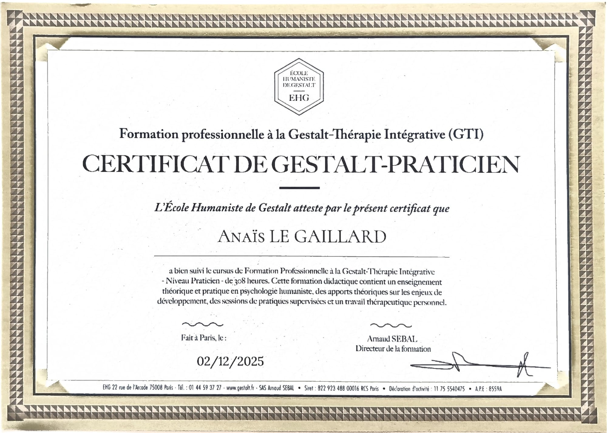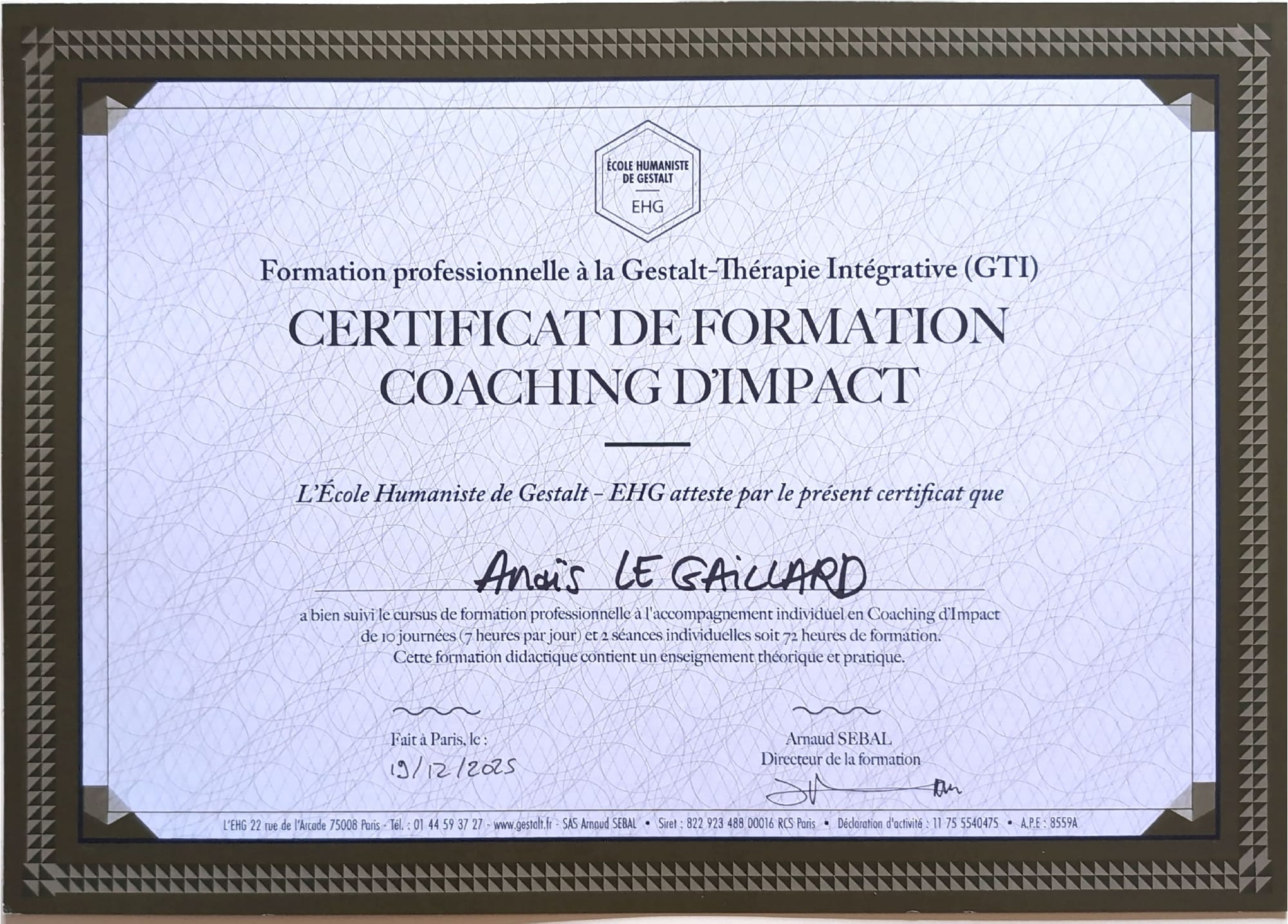 Formée en Gestalt et en coaching, je m’inscris dans le cadre du code de déontologie de l’École Humaniste de Gestalt, fondé sur la confidentialité, la bienveillance et le non-jugement.
